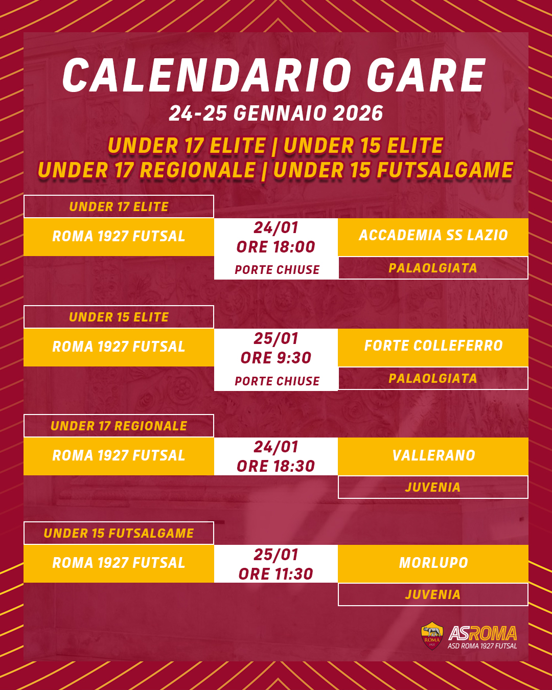 Dalla Roma 1927 Futsal Next all'Under 15 Futsalgame, il programma completo.